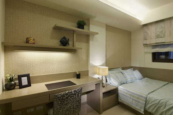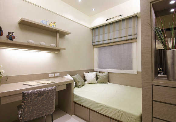 男孩房以略带中性彩度安排男孩的卧眠区域,阅读区、收纳间表示层架的设计,完全以孩童的生活需求考虑为主。