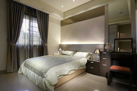 主卧主墙面以色彩及材质做层次上的安排,使其不致于单调而具延展的空间效果,精致而优雅的展现卧眠时需要的宁静氛围。衣柜柜体部分以清浅颜色的木作搭配玻璃,形塑出柜体的轻重比例,化解可能造成空间的压迫感。