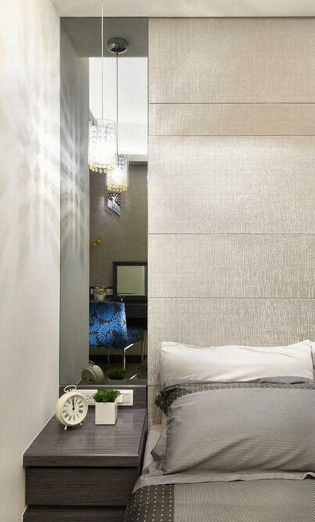 为了加深视觉的延续感,于是衣柜材质上以黑镜配置木作的方式,利用其折射原理,同时降低空间压迫感。