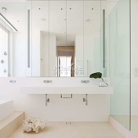 浴室整体为简洁纯净的白色,洗手台上正面墙的镜子反射着狭小的空间,既让浴室显得通透明亮又极大的在视觉上延伸了空间感。