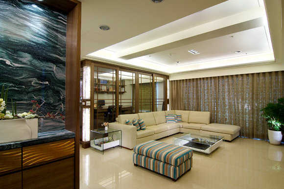 主要建材:白金翡翠大理石、波浪造型板、茶镜、壁布、玻璃、琥珀石、金纱玻璃、木作、树脂、板岩