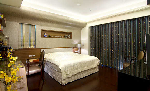卧室空间主要以生活机能完善为主,藉由木作或壁布这类可适度增添温暖调性的材质为主,色彩方面也以柔和搭配深色作为平衡配置。