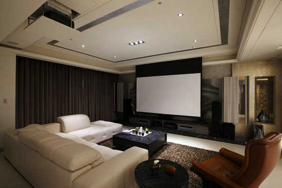 电视墙的烟波山水大理石,特殊如泼墨画般大器,并搭配120吋大屏幕,以及顶级的视听设备,客厅就像是私人电影院,满足了屋主的视听享受。