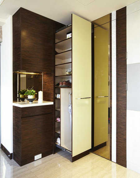 玄关收纳-抽拉式收纳的鞋柜设计,妥善应用柱体旁畸零空间。透过走道上造型门片的整合,藉由拉门开阖变化出双套房的实用机能