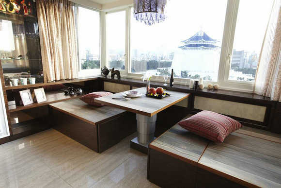 【太平洋家居网 设计频道】因为地理位置关系,个案本身拥有绝佳视野,业主与设计师周靖雅沟通后决定将窗边留下,架高做入收纳与和室电动升降桌,舍弃原本的制式用餐想象,享受休憩、品尝美食的生活时光。