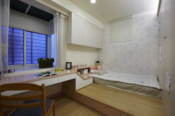 女儿房-窗户前的小平台改造,让小朋友有了布置的小天地。衣柜上、下施以间接光源照明,轻量化的量体存在。