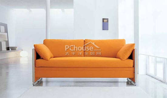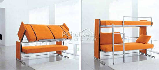 这张橙色的沙发乍看上去除了颜色活泼之外毫无特色 ,可实际上它可通过由底部的反转,加上安全的支架固定成为一张上下铺的床,上铺的床侧面有着栏杆来支撑和保护。