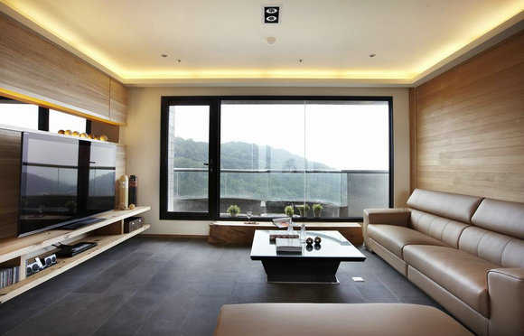 梧桐木皮的铺陈,大器带出电视主墙面的存在,局部的间接光带设定,加以茶镜折射迷蒙出协调风景。玄关起始木皮线条循序导引,让人有了投入自然怀抱的心境转换。