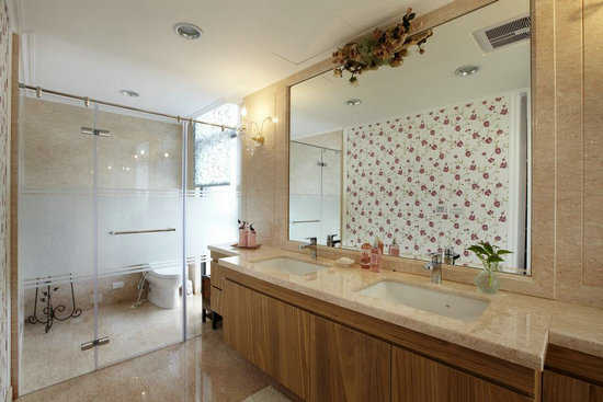 拥有双洗手枱,波斯粉红大理石搭配碎花壁纸浪漫到令人陶醉。