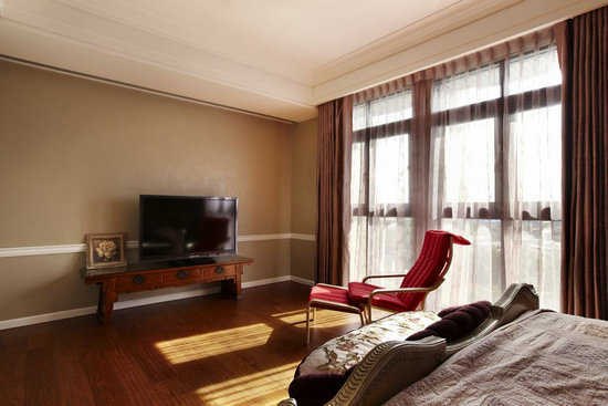 大面落地窗阳台洒落唤醒一天全新的开始,没有过多的收纳柜体,简单的摆放电视及单椅,让空间展现纯粹感。