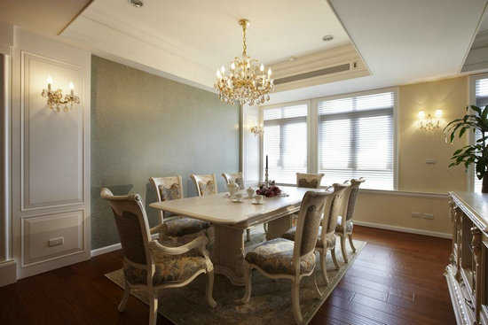 浪漫典雅的水晶灯搭配十足美式乡村的餐桌椅,让用餐气氛更有情调。