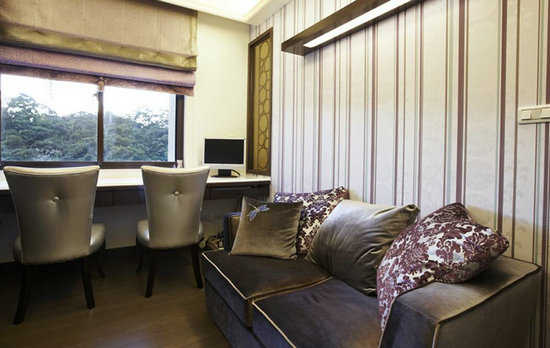 电视主墙以具有特殊纹理的大理石做背景表情,左右以茶玻、造型板形塑穿透意象,使书房的墙面,开阔而具通透感。沙发背墙运用具有质感的皮革,做成绷布的效果,让墙面具有丰富的立体感。