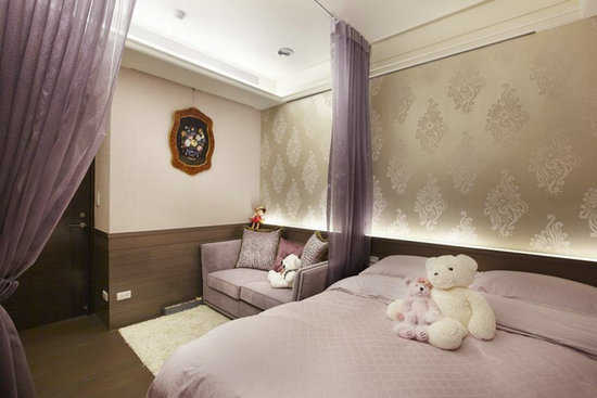 小孩房以浪漫的公主风格铺陈,床头是壁纸加上珠帘的设计,柜体柜门上贴附壁纸的感觉,与使用的窗帘相呼应。