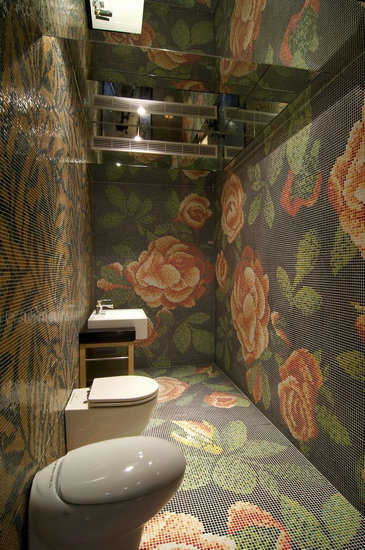 设计师将巨型花语从壁面连贯至地面空间,对向地壁面再以相同地语汇、不同地色彩呈现,在天花明镜反射帮助下,小坪数地卫浴空间反倒成数倍放大。