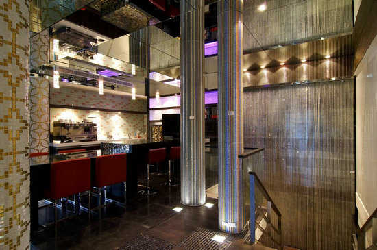巨大地圆柱以不同色泽地马赛克磁砖以不同地图腾表现所包覆,在镜面天花地反射下呈现通天霸气地豪华气势。马赛克圆住及水晶线帘混搭壁砖带出餐饮区奢华气质。