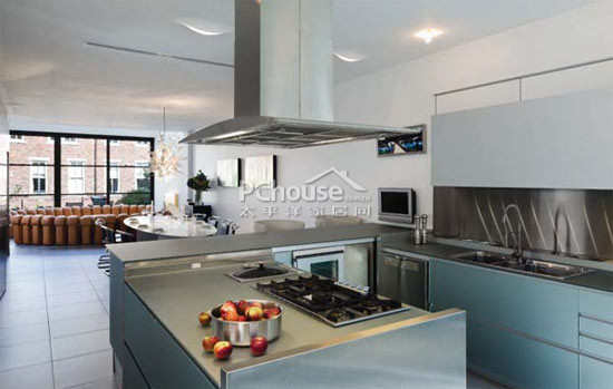 厨房简约,设备齐全,淡蓝色与白色的配合,配出海边的小清新感觉。