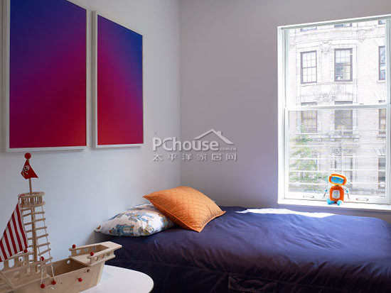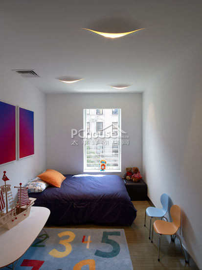 儿童房最大的特色就是缤纷色彩的运用,例如紫色的床单和橙色的枕头,还有很有可爱的元素,例如数字地毯和天花似笑容的灯饰。