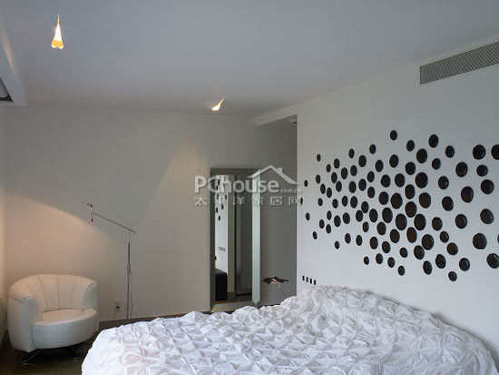 主卧室的设计偏向简约,黑色的波点和白色的独特门环床被配合起来既俏皮,又时尚。