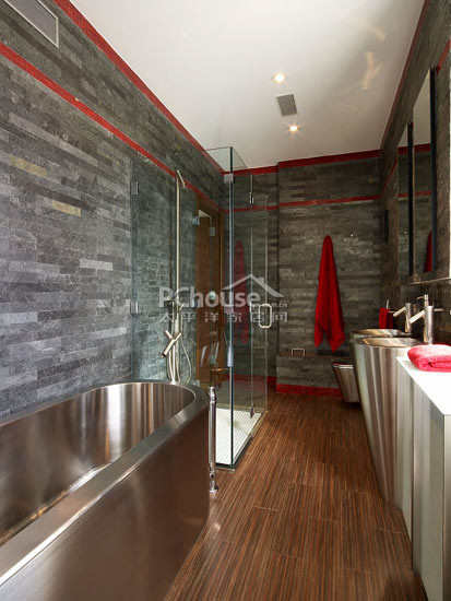 卫浴设计金属感比较重,其卫浴设备都是用钢制品,为了让整个空间比较和谐,不会太生硬,所以地板的铺设使用的是木地板,墙身则是复古深灰色的。