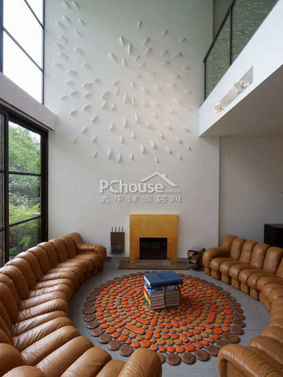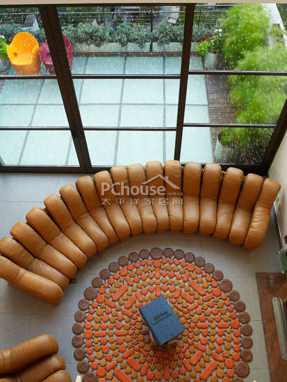 客厅的玻璃隔墙使得空间延伸到户外平台,可以俯瞰到下面的私家花园。
