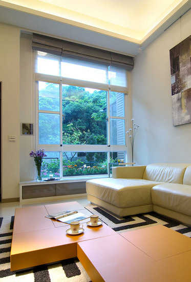 低台度大面窗揽入室外景观,为突显舒朗阔绰的空间感,搭配几何方形矮几、矮背式沙发,高度降低,空间视觉感更显挑高。