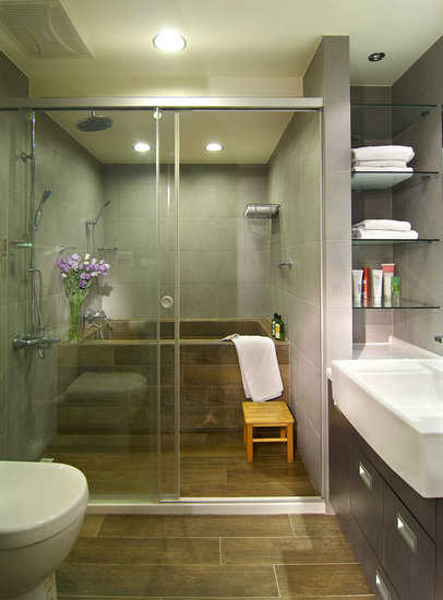由于屋主一家人都很喜欢泡澡,设计师特地砌出足以提供三人泡澡的大浴缸,并于墙面使用板岩、地坪挑选木纹地砖,仿日式汤屋的设计手法,增添泡澡的视觉气氛。