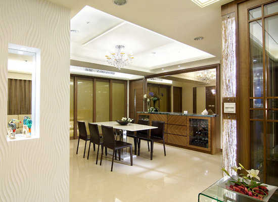 【太平洋家居网 设计频道】由境庭设计团队设计的本案,即是一个充份发挥材质特性之美的案例。对于材质的选用搭配,境庭设计特别精准到位,本案运用玻璃、镜面等通透材质,让整个公共空间宽阔之外,更显大器。而端景台面的大理石与波浪造型板的运用,还有透光性强的树脂等等,无处不是创意巧思的具体展现。