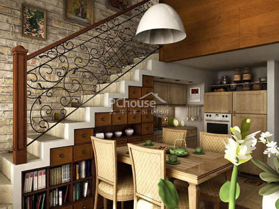 位于厨房餐厅旁边的欧式古典楼梯,安装上了精致的小抽屉,这和厨房餐厅的功能连成一体,精妙难以言语。