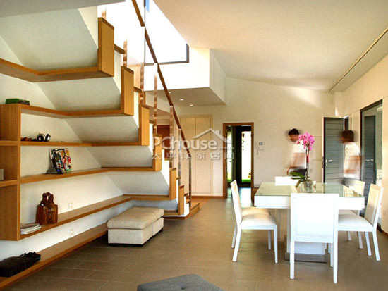 楼梯下的搁板沿着楼梯内侧墙面往里延伸,强调了线条的流畅性。