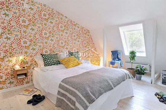 壁纸选择的变换,会使得整个卧室的感觉都会不一样。搭配森林系的床品,印花壁纸让卧室变得清新可爱。