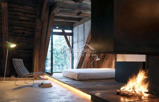 不同的木材可以营造不同的气氛,上图中,深色且经过做旧处理的木材散发出神秘的气息,配上黑色的壁炉,魔幻感更加强烈。
