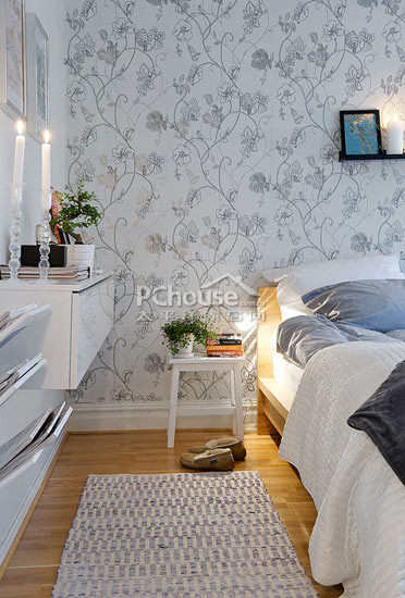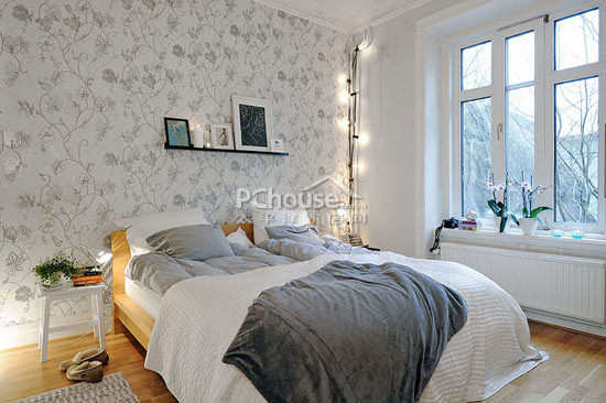 浅灰色花纹墙纸,配上浅灰色系的床品,以及颜色比较温和的木地板,打造了一个素雅的卧室。