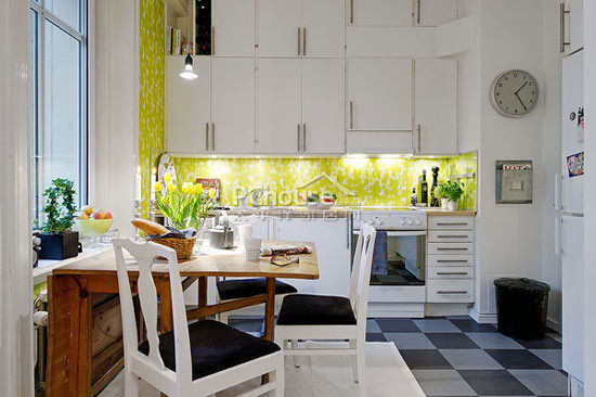 虽然厨房的设备和餐桌都不是很大,但是别有一番精致,白色的厨房配上木制的餐桌带来更多的温暖。