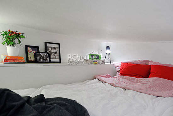 床的位置比较高,但是依旧很美观,红色和白色的床品搭配突出的活力,绿色植物则是点缀了这个空间。