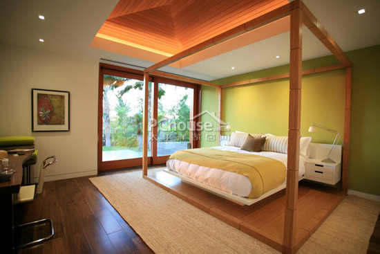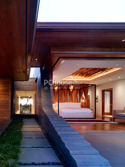 中央走廊连接着主卧室,多媒体室和户外庭院,半开放式的主卧室区域明确。
