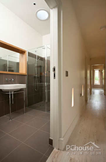卫浴室设置在走廊旁,干湿区分开,空间并不大,高效地使用房屋的水平空间,与房间的门形成一条直线,具有整体性。