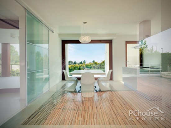 时尚的餐厅设计,巧妙的应用了玻璃的反光效果,增强亮度。餐桌前的大玻璃带来了一幅风景优美的画卷。