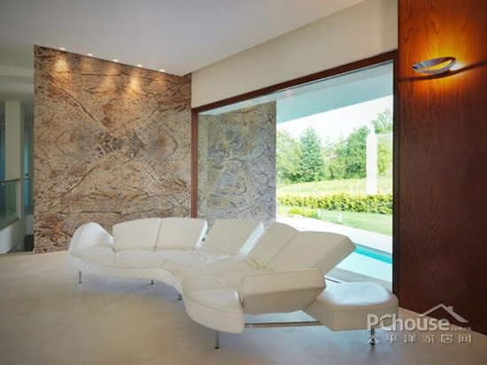 在起居室里,大窗户打开了游泳池及其周围的景观。深色墙纸把各功能区域进行明显划分,同时也能减弱光线的反射。