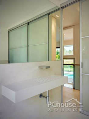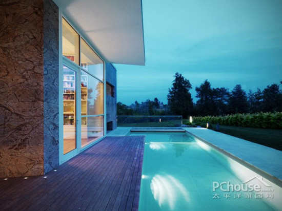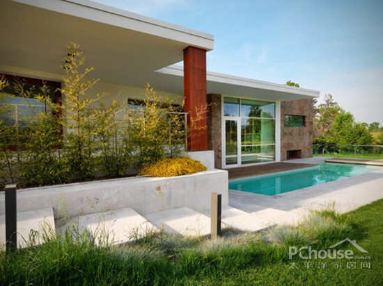 在泳池区里,白色的混凝土石阶连接着主要的进门位置和花园,与池中水的蓝色形成对比。