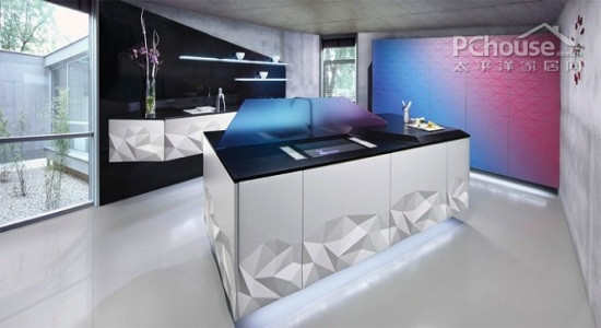 厨房的设计也很重要。在一个令人心情愉悦的地方做饭是一大乐趣。我们在桌面上切割出似乎纯天然而成的冰面设计,干净而美观,同时渐变的色彩设计,仿佛有灯光打来的美感,似与自然相融合。