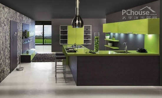 同时,我们也有别样的色彩方案。看这纯黑的厨房,用浅绿色进行表面的装点,使空间有了一种草坪的感觉,但又不失黑色的高贵之感,但同时又兼顾了一种轻松自然的感觉。