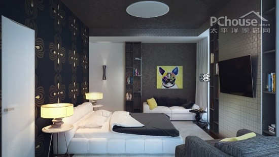 黑色的墙体,黑色的天花板似乎令整个房间有点昏暗。但是,床头那一抹浅黄色,柔和的灯光,又给整个房间带来了温暖与光亮,使得黑色这个主色调不仅不显得深沉,反而是一种大气的体现。