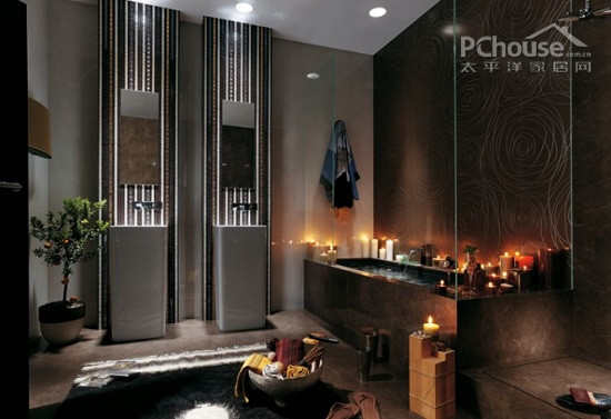 再来看看卫浴的设计。这个卫浴间以黑色为主色调,显得非常大气。卫浴间里应有尽有,配上烛光的点缀,显得特别有气氛。印花的墙体和植物更是为卫生间增添了情调,相信在这样的环境中,您一定能彻底放下一身的劳累,好好洗漱、放松休息。
