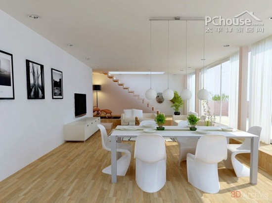 在色调的选择方面,您也可以放心大胆地选择同样一种颜色来粉刷客厅和餐厅。统一的白色并不会使客厅或是餐厅显得过于单调,反而令人觉得非常清爽干净,整洁明亮。配上深色的地毯和一些小件家具,更显美感。