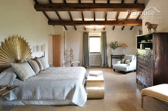 卧室同样有着浓浓的意大利风情。天花板沿用了客厅的横梁设计,而在家具的选择上,五斗橱的复古风与沙发、床的欧式风格相得益彰。在床头,一把金光灿烂的扇状装饰品,更是令空间显得尊贵。