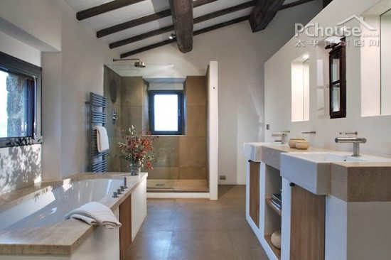 卫生间的装修也很讲究。同样有木质横梁的运用,在颜色上虽然只有白色与浅棕色,但干净的颜色,令空间清爽整洁。充足的采光条件,令空间明亮温馨。以浴缸取代淋浴装置,更是会令您身心得以彻底的舒爽。
