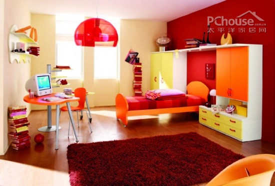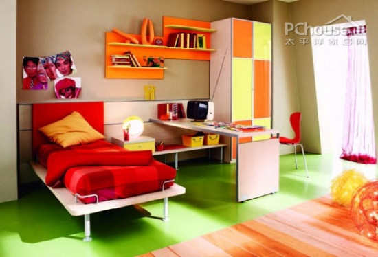 红色与绿色的搭配还不够!在这个空间中,还有橙色与绿色、黄色与绿色的搭配!红色的床垫、橙黄两色的橱柜配以绿色的地面塑料纸,整个空间非但不怪异,反而呈现出一种别样的魅力,一种前所未见的色彩魅力。