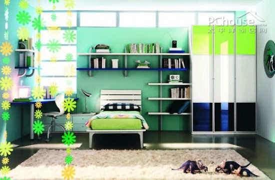 翠绿色的墙体,令整个空间焕发出清新活力的色彩。整间儿童房的采光条件特别好,两扇巨大的玻璃窗,映照着室内的色彩更为鲜艳明媚。同时,绿色的墙面也与室外的植物遥相呼应。
