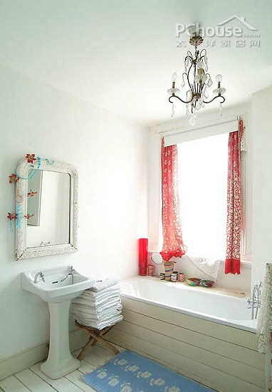 编辑点评:卫生间也是白色的基调。白色使空间更加干净,更加整洁。而为了使空间不再清冷,设计师选用了红色的窗帘,并在镜框出镶上了别致的装饰,再配以一张蓝色的地毯,整个空间纯净又不失生活的气息。