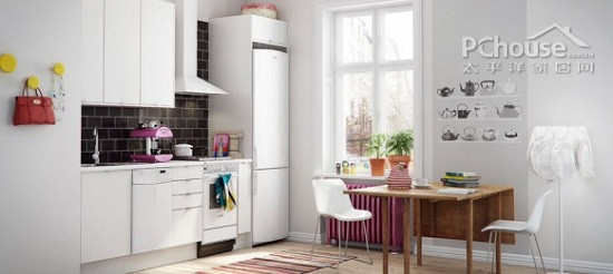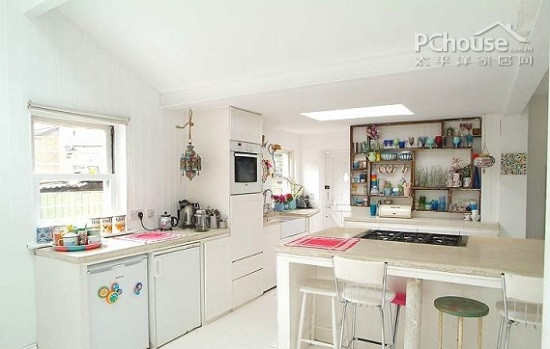 编辑点评:厨房中也是白色为主色调,而各种彩色的厨房用具,又点缀着整个空间。厨房的托架,俨然成为了整个空间中多彩靓丽的地方,为整个素雅的空间带来了无限的活力与趣味。